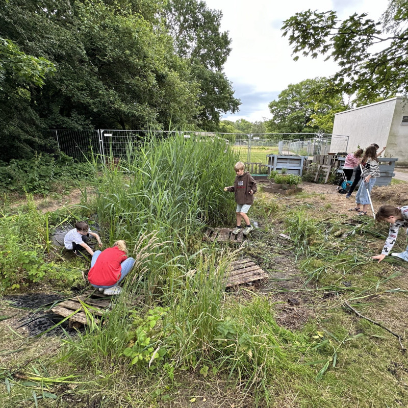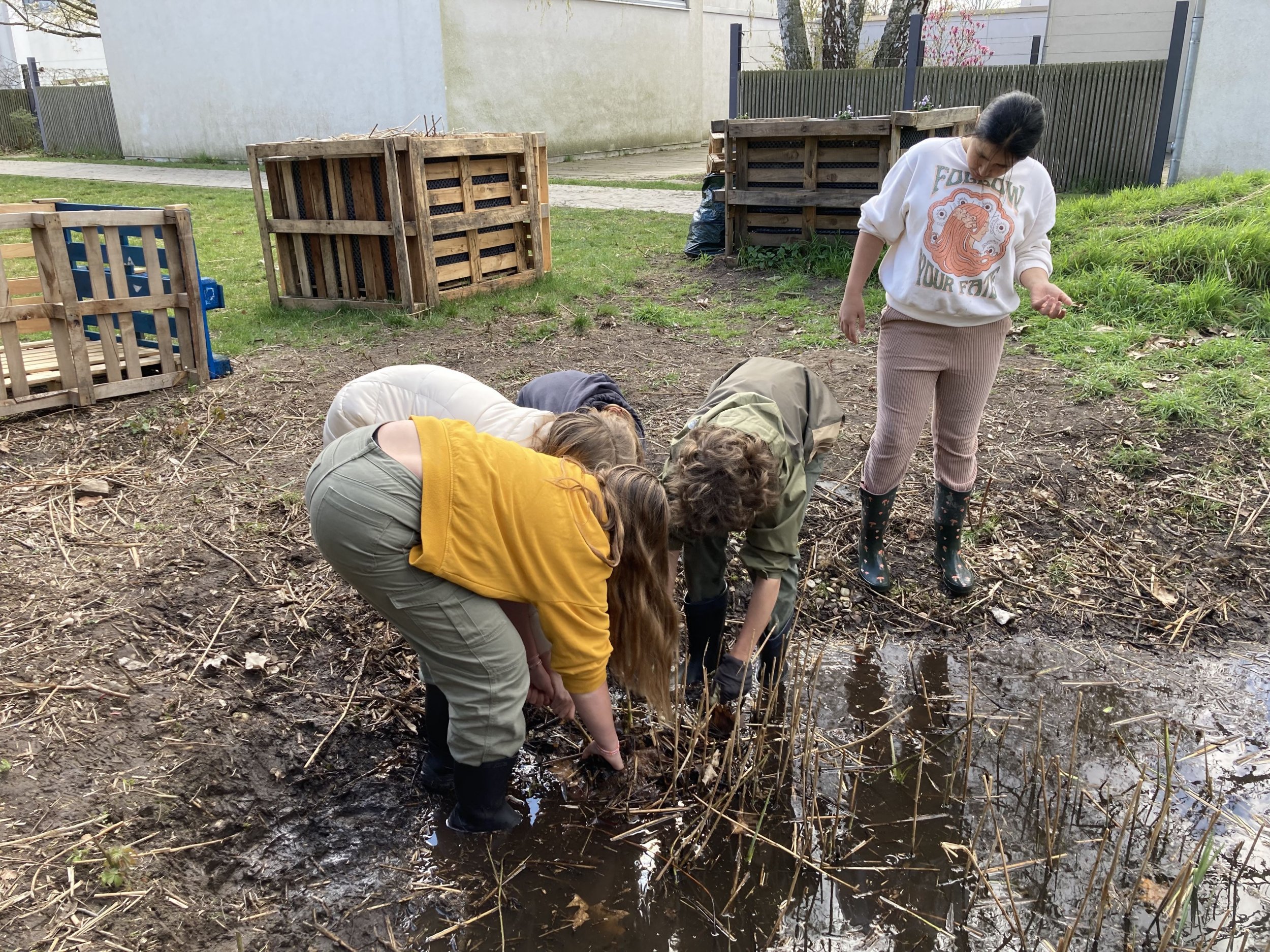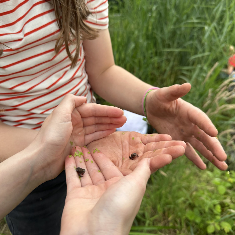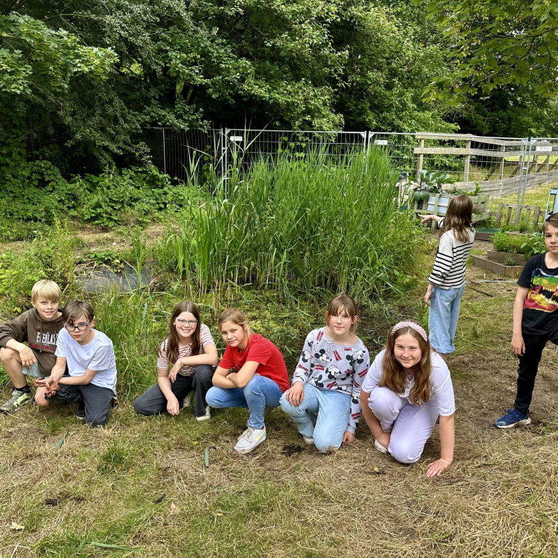 Die Umwelt-AG (hauptsächlich Bereich Schulgarten) sowie die Grünschnäbel-AG (hauptsächlich Bereich Teich) kümmern sich um die Aufrechterhaltung dieses wunderschönen Fleckchens. Im Teich leben viele verschiedene Tiere. Aktuell können ganz viele kleine Erdkröten beobachtet werden, die gerade ihre Entwicklung zur Kröte abgeschlossen haben und noch Schutz im Uferbereich des Teiches suchen. Dieses Jahr konnten sich sehr viele Erdkröten in unserem Teich entwickeln was zukünftig dazu führen wird, dass es wahrscheinlich sogar noch mehr werden. Denn Erdkröten versuchen zum Laichen immer wieder zurück zu dem Gewässer zu kommen, in dem sie auch selbst geschlüpft sind.