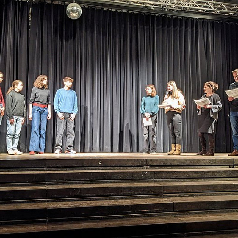 "Sollen für größere Autos höhere Parkgebühren vorgeschrieben werden?" debattierten Aurelia, Lena, Christian und Lilli im Schulentscheid der Altersstufe I des bundesweiten Wettbewerbs "Jugend debattiert". Eröffnet wurde die Veranstaltung für die Jahrgänge acht bis zehn von der Band der Elsa-Brändström-Schule. Während die Jury (Regionalsiegerin 21/22 Flora, Frau Rinderspacher, Herr Ammerlahn und Frau Ebner) sich beriet, sorgte der Kurs "Darstellendes Spiel" von Herrn Müller für Abwechslung. Für die Altersstufe II debattierten im Anschluss Hannes, Chanel, Anton und Tim die Frage "Sollen Angriffe auf Kunstwerke härter bestraft werden?" vor den Juror*innen Hans Jonas (Jg. 11), Herrn Meyer, Herrn Kersten und Frau Fleger.