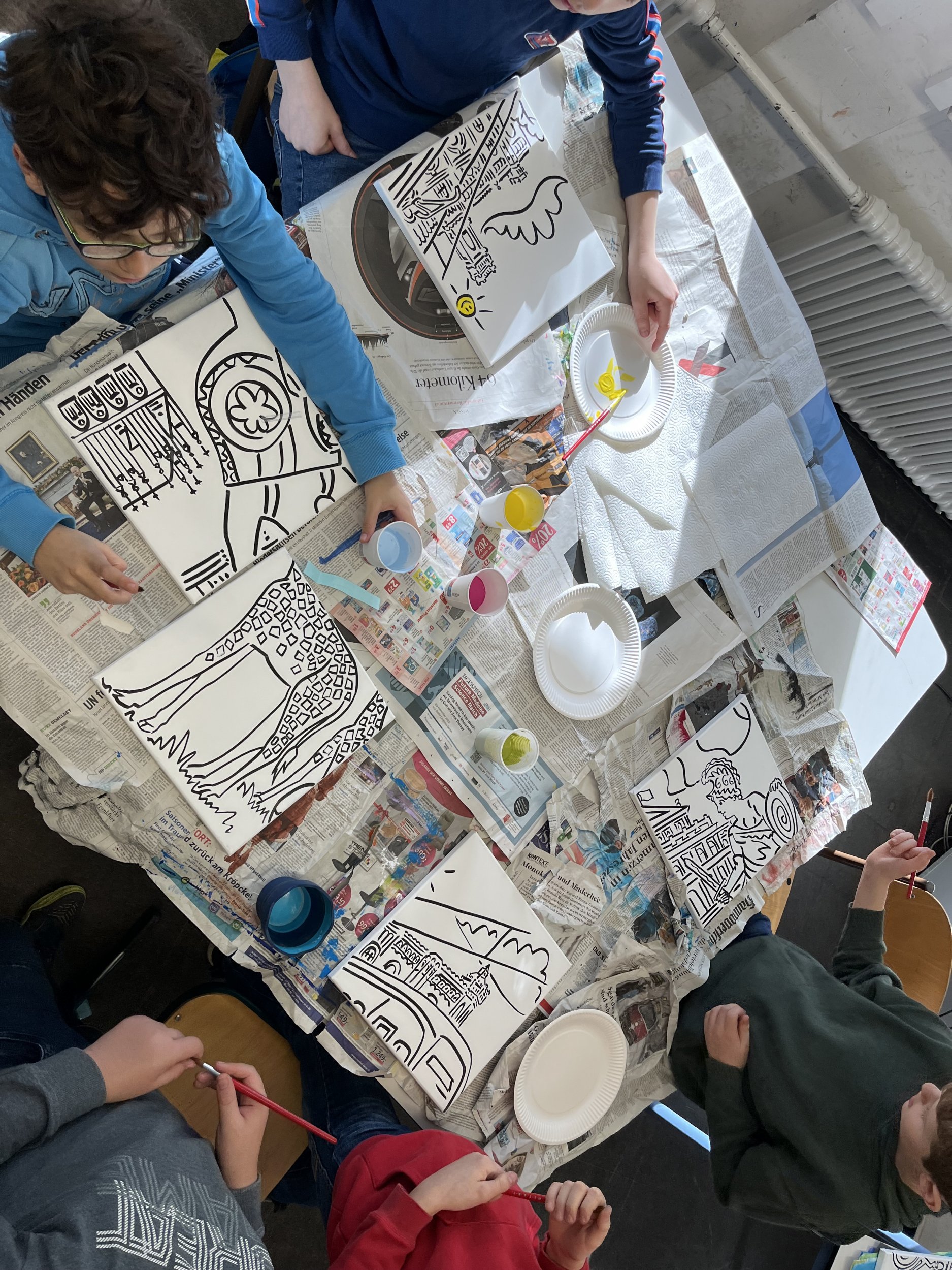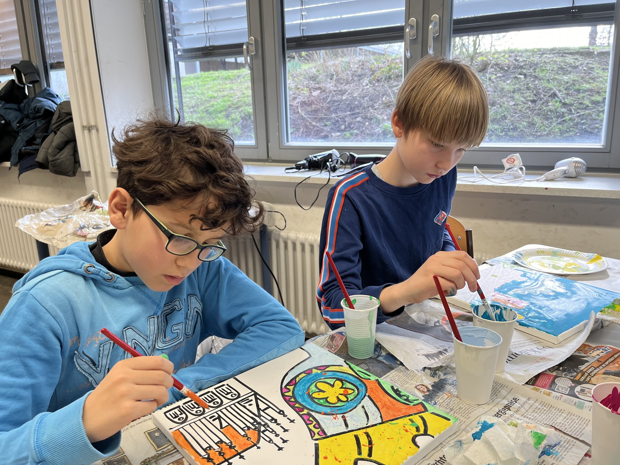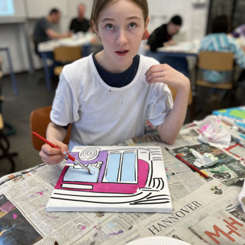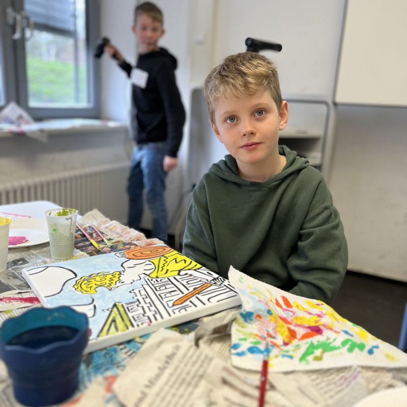 Nach einem gemeinsamen gemütlichen Frühstück in unserem Klassenraum mit Käse, Brötchen und leckerem Obst und Gemüse ging es in den Kunstbereich der Elsa. Hier wurden zunächst die einzelnen Rahmen per Losverfahren verteilt und dann ging es auch schon los. Das Klassenlehrerteam und Herr Davies unterstützten die Schülerinnen und Schüler der 6B dabei ihre eigenen Ideen zu entwickeln und auf die Leinwand zu bringen. Das Ganze lief in fröhlicher und entspannter Atmosphäre ab. Man konnte allen Beteiligten den künstlerischen „Flow“ förmlich ansehen.