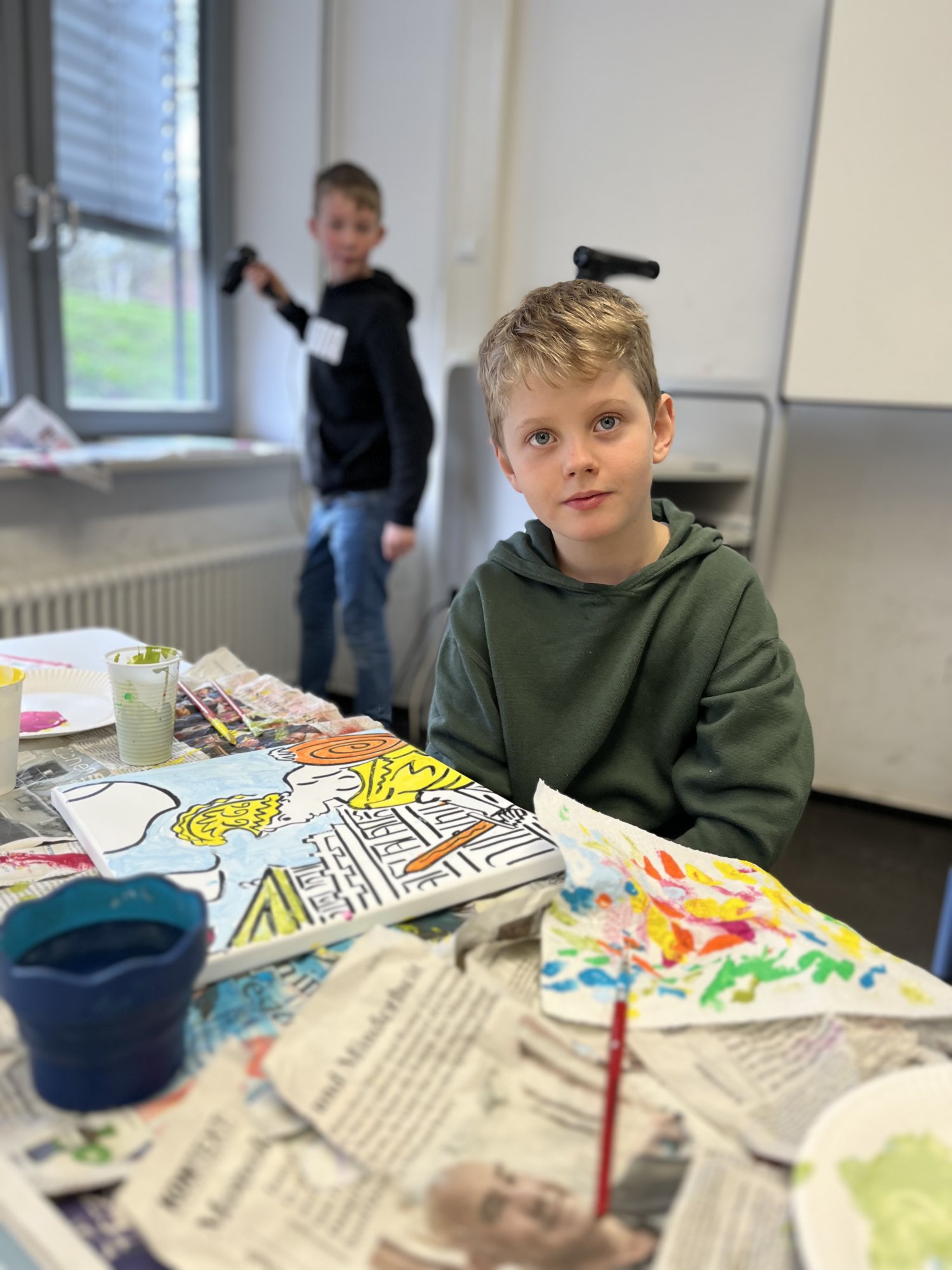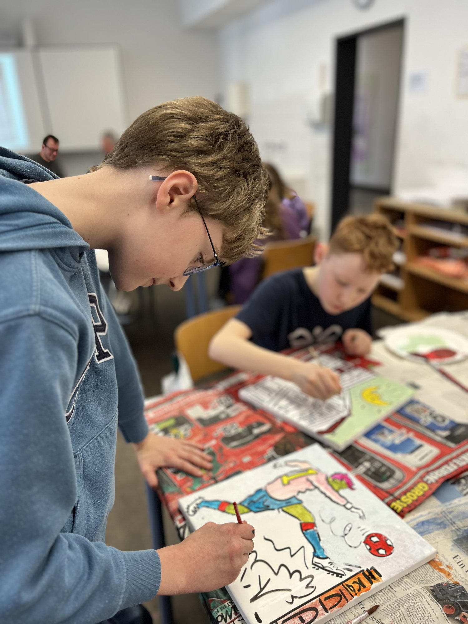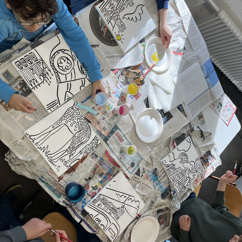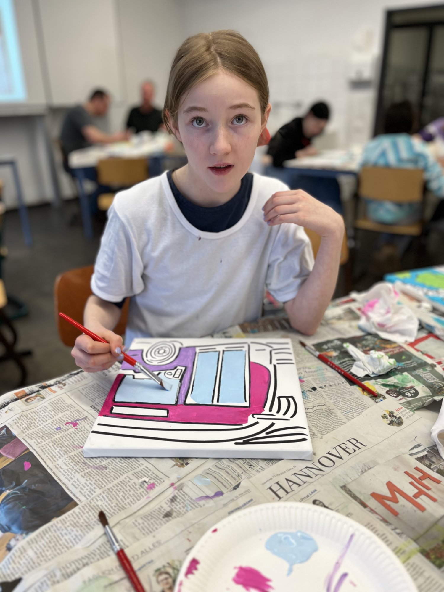 Nach einem gemeinsamen gemütlichen Frühstück in unserem Klassenraum mit Käse, Brötchen und leckerem Obst und Gemüse ging es in den Kunstbereich der Elsa. Hier wurden zunächst die einzelnen Rahmen per Losverfahren verteilt und dann ging es auch schon los. Das Klassenlehrerteam und Herr Davies unterstützten die Schülerinnen und Schüler der 6B dabei ihre eigenen Ideen zu entwickeln und auf die Leinwand zu bringen. Das Ganze lief in fröhlicher und entspannter Atmosphäre ab. Man konnte allen Beteiligten den künstlerischen „Flow“ förmlich ansehen.