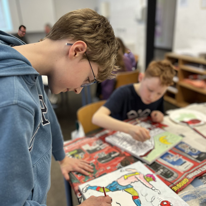 Im Februar 2024 war es dann soweit. An einem Freitag besuchte uns der aus Wales stammende britische Pop-Art-Künstler Tim Davies, um mit uns gemeinsam eine großformatige, inspirierende Collage zu gestalten.