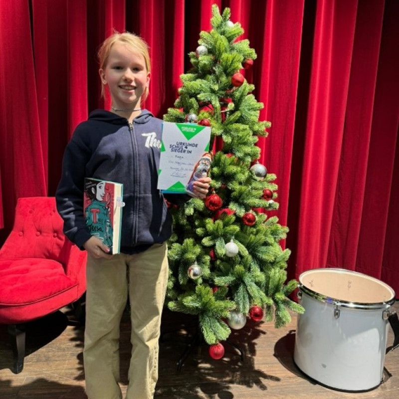 So kam das Publikum zunächst in den Genuss der vier selbst gewählten Bücher und daher auch ganz unterschiedlichen Texte und konnte danach staunen, wie gut die vier Leser:innen auch mit einem für sie völlig fremden Text zurechtkamen, den sie ohne Vorbereitung vorlesen mussten. Eine Jury, die aus zwei Lehrerinnen, einem Vertreter der SV und einem des Fördervereins bestand, entschied dann, dass Thea von den vieren am besten gelesen hat. Sie ist als Siegerin in der nächsten Runde beim Stadtentscheid dabei. Toll!