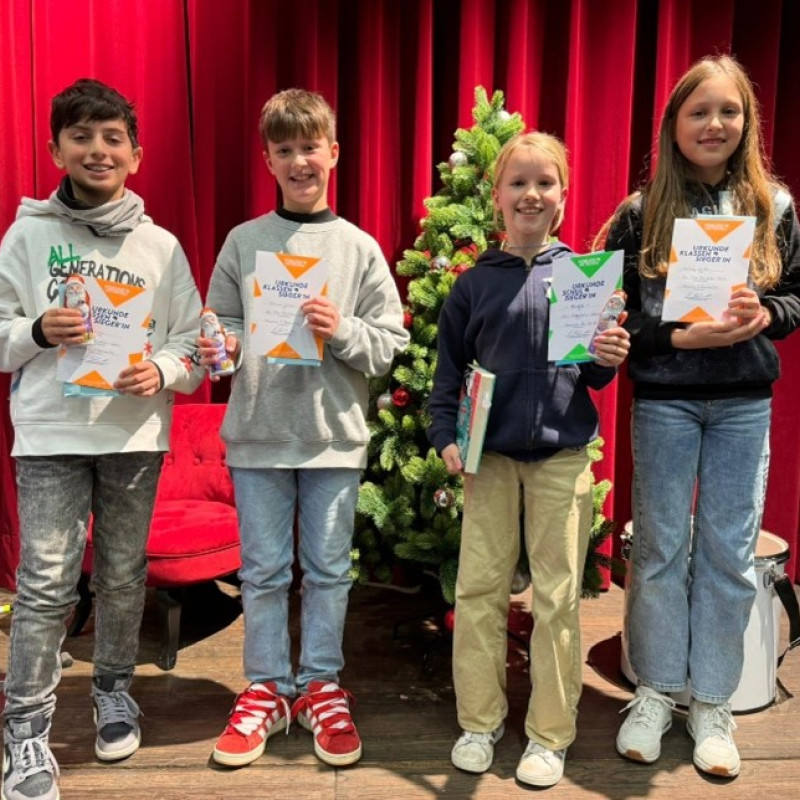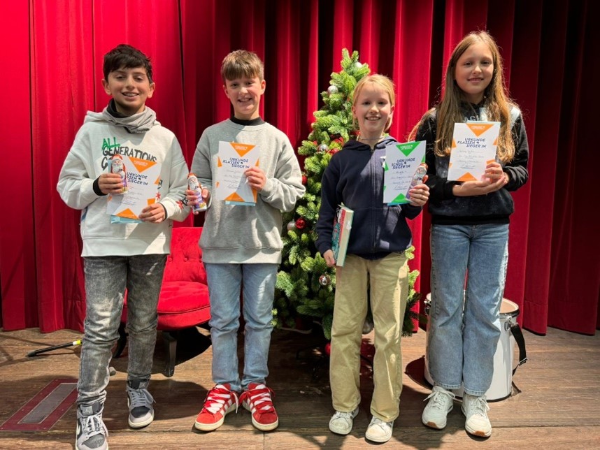 So auch am 6. Dezember 2024. Da saßen Solveig D. (6a), Shlomo L. (6b), Koray I. (6c) und Thea H. (6f) auf der Bühne und wollten einem sehr lebhaften Publikum ihre Bücher vorstellen. Die Klassen wollten ihre Unterstützung für ihre Kandidat:innen zunächst durch lautes Klatschen und Anfeuern zeigen, aber sie haben auch schnell verstanden, dass sich ein Vorlesewettbewerb von einem Fußballspiel in einem Stadion unterscheidet. Um eine Geschichte zu verstehen, ihre Stimmung zu erfassen, brauchen sowohl diejenigen, die vorlesen, als auch die diejenigen, die zuhören und lauschen, Aufmerksamkeit und einen ruhigen Raum, in dem sich die Worte entfalten können. Und das ist dann tatsächlich auch gelungen!