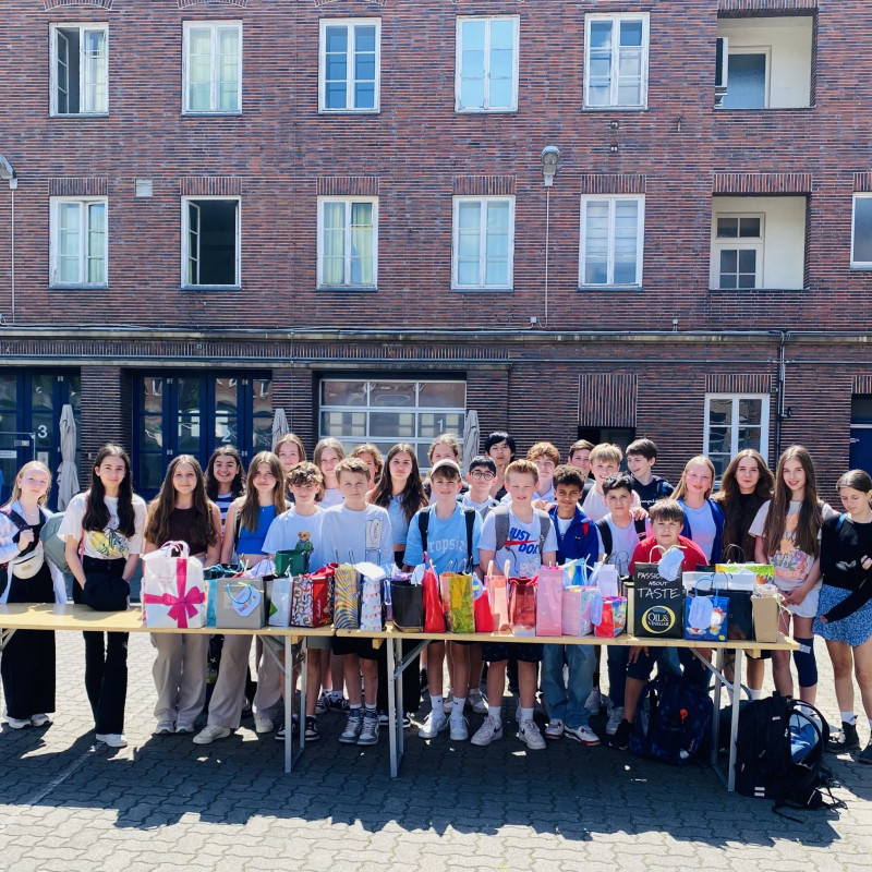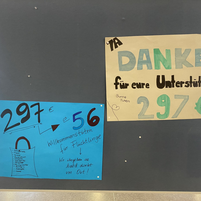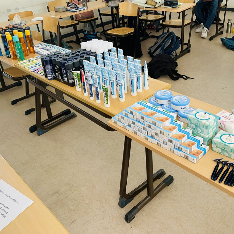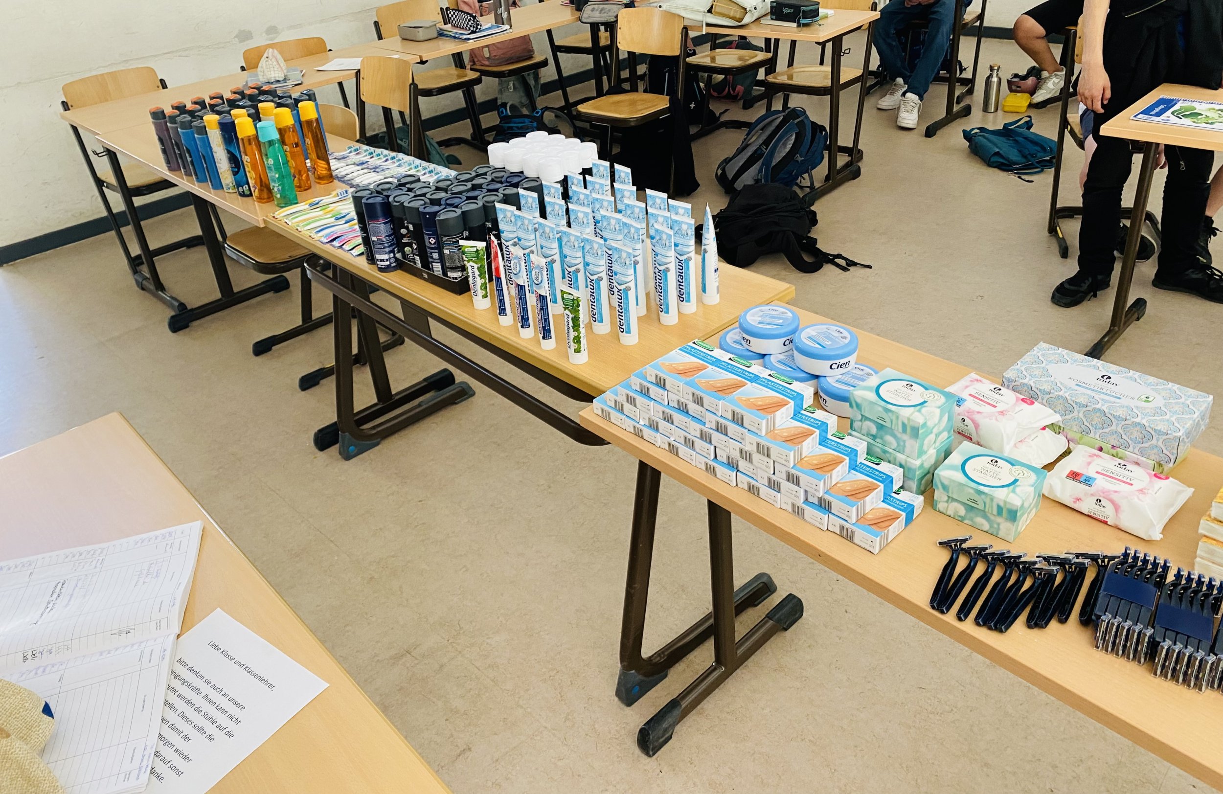 Neben der Behandlung von Spezialthemen wie Migration und Fluchtbewegungen weltweit, Frauenrechten in Südamerika oder einer vertieften Raumanalyse Mexikos haben sich einige Gruppen zusammengeschlossen, um eine Spendenaktion zu initiieren. Nach Recherchen konnten sie sich darauf festlegen, vor Ort und nicht nach Südamerika zu spenden. Über den Kontakt zu Frau Charlotte Laube über den Unterstützerverein von Flüchtlingsunterkünften (UFU) hat sich eine Zusammenarbeit mit einem DRK Flüchtlingsheim für junge Männer ganz in der Nähe der Schule ergeben. Gefragt waren Willkommenstüten mit Hygieneprodukten und Süßigkeiten, so dass wir über den Verkauf von Kuchen und bunten Tüten in den zweiten Pausen Spendengelder generieren konnten, die wir dann für Rasiergeld, Duschbad, Schokolade und vieles Weitere einsetzten.