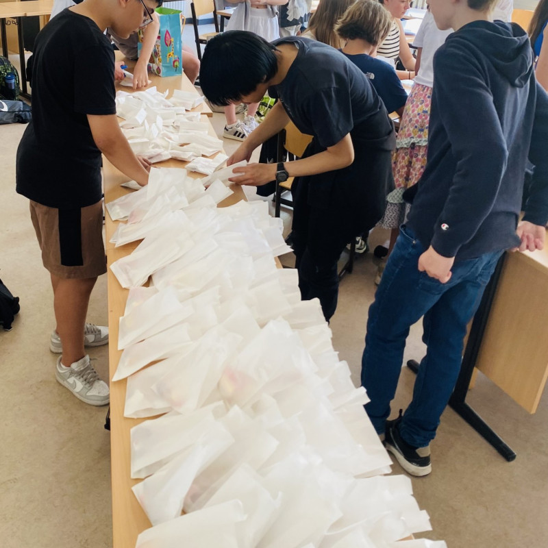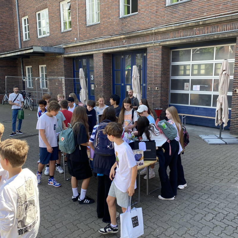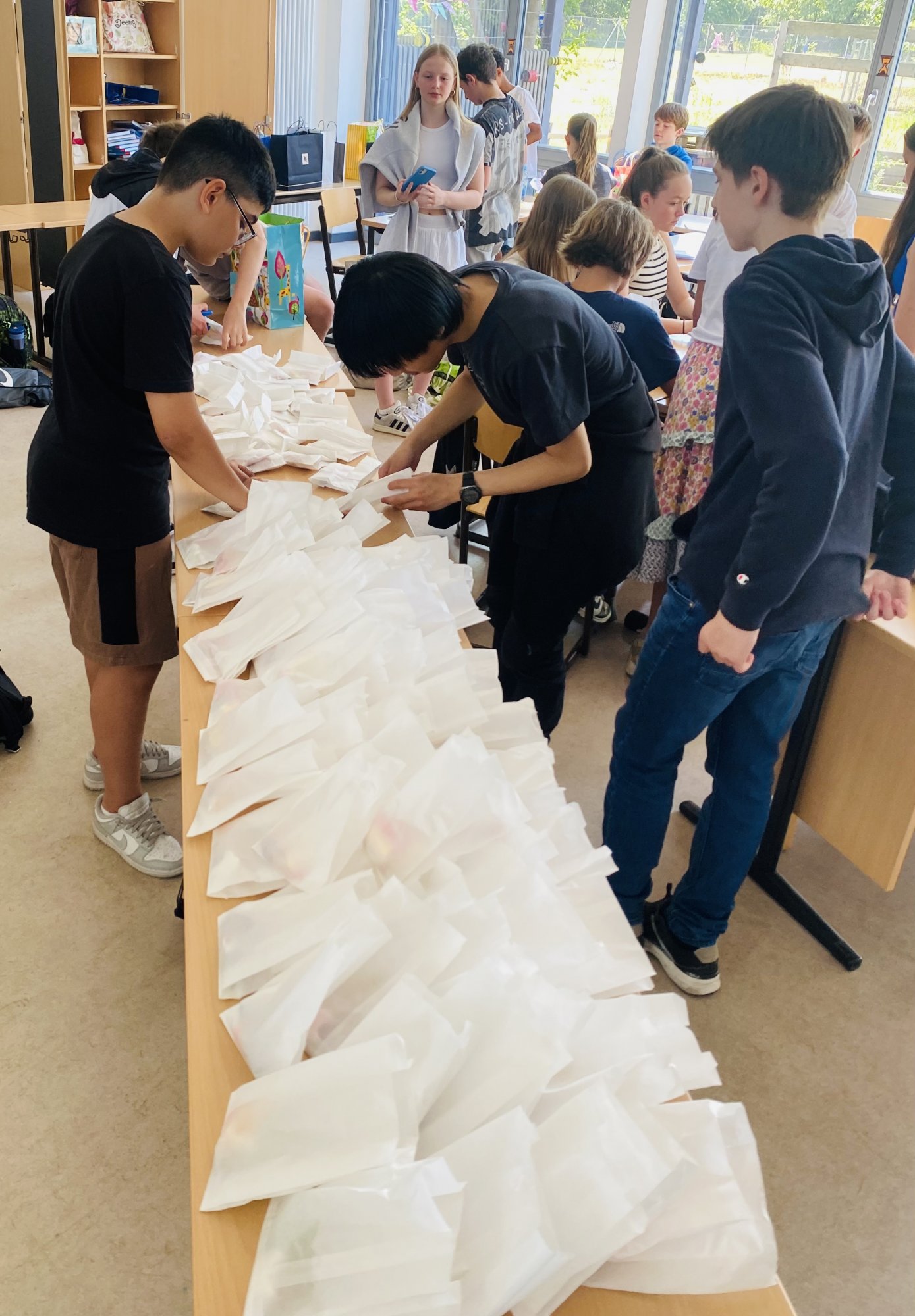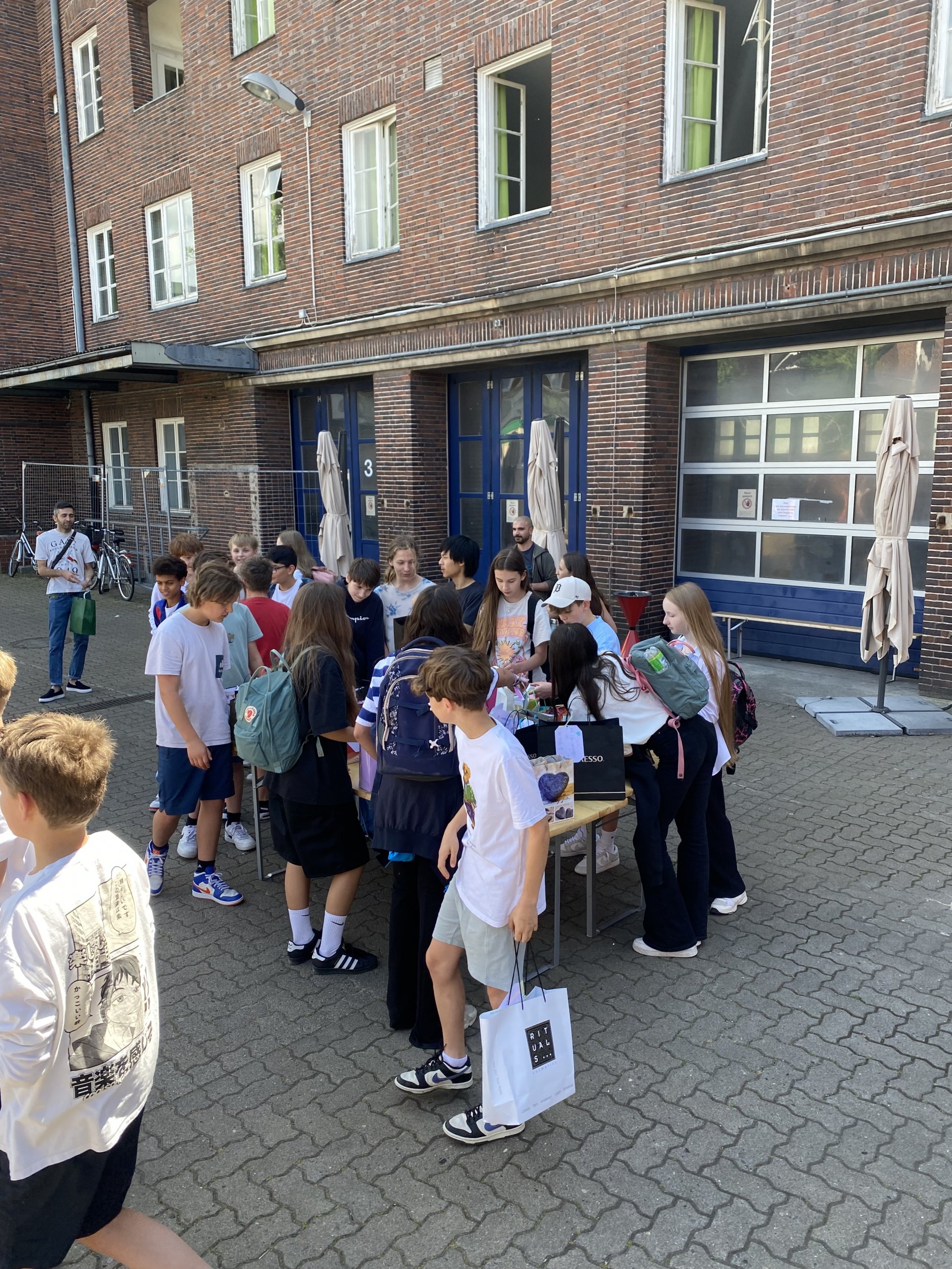 Am 27. Juni 2023 war es endlich so weit und wir zogen mit ca. 60 Tüten los, um diese persönlich zu übergeben. Das Treffen mit den geflüchteten Männern aus den unterschiedlichsten Ländern war herzerwärmend und ein echtes menschliches Highlight zum Ende des Schuljahres. Schnell rückten die dankbar entgegengenommenen Willkommenstüten in den Hintergrund und stattdessen die reale Begegnung in den Vordergrund. Obwohl der Unterricht nach der 6. Stunde längst beendet war, wurde auf dem Innenhof der alten Feuerwehr immer noch gemeinsam Fußball gespielt und Selfies geschossen.