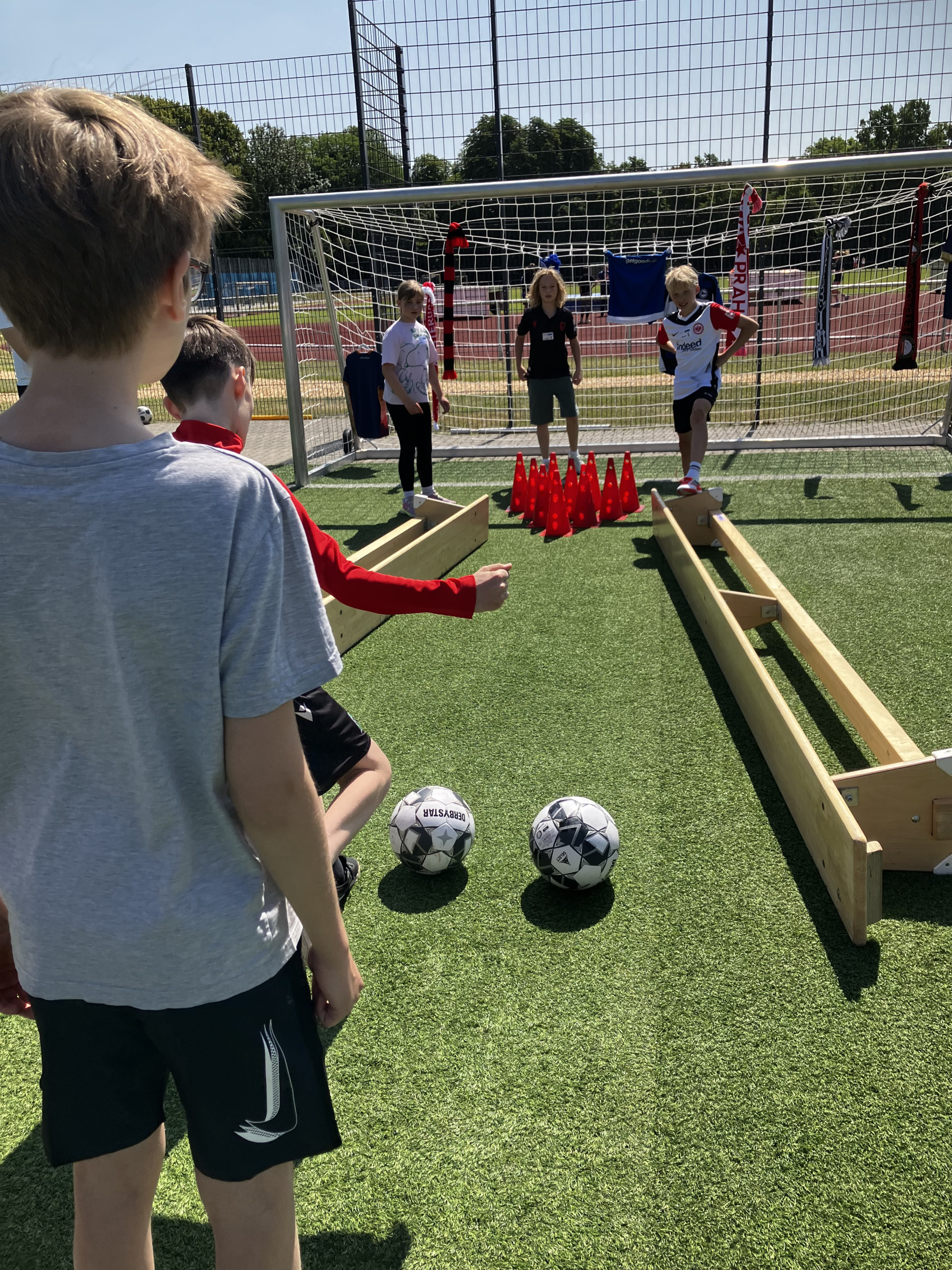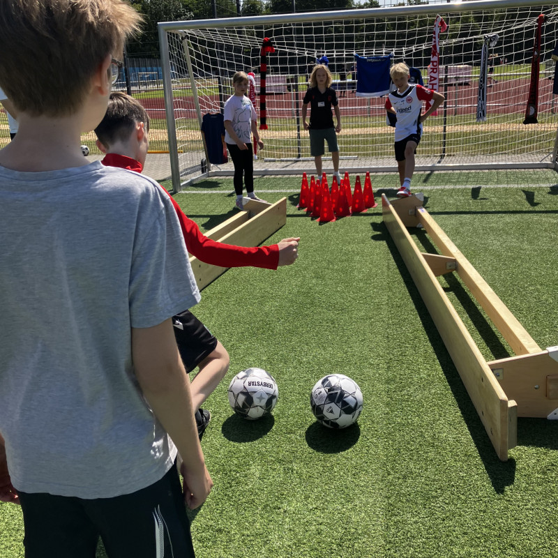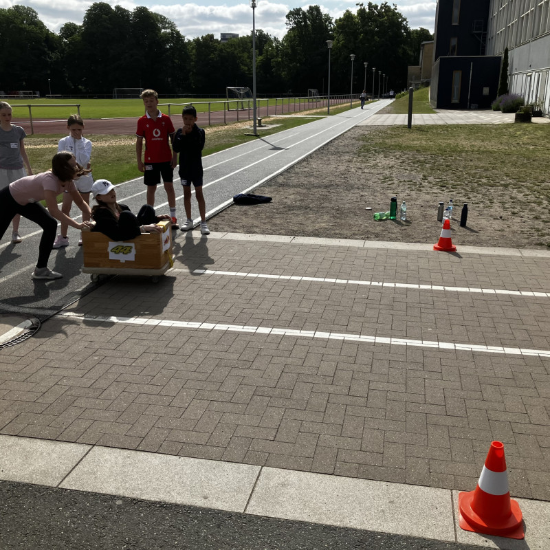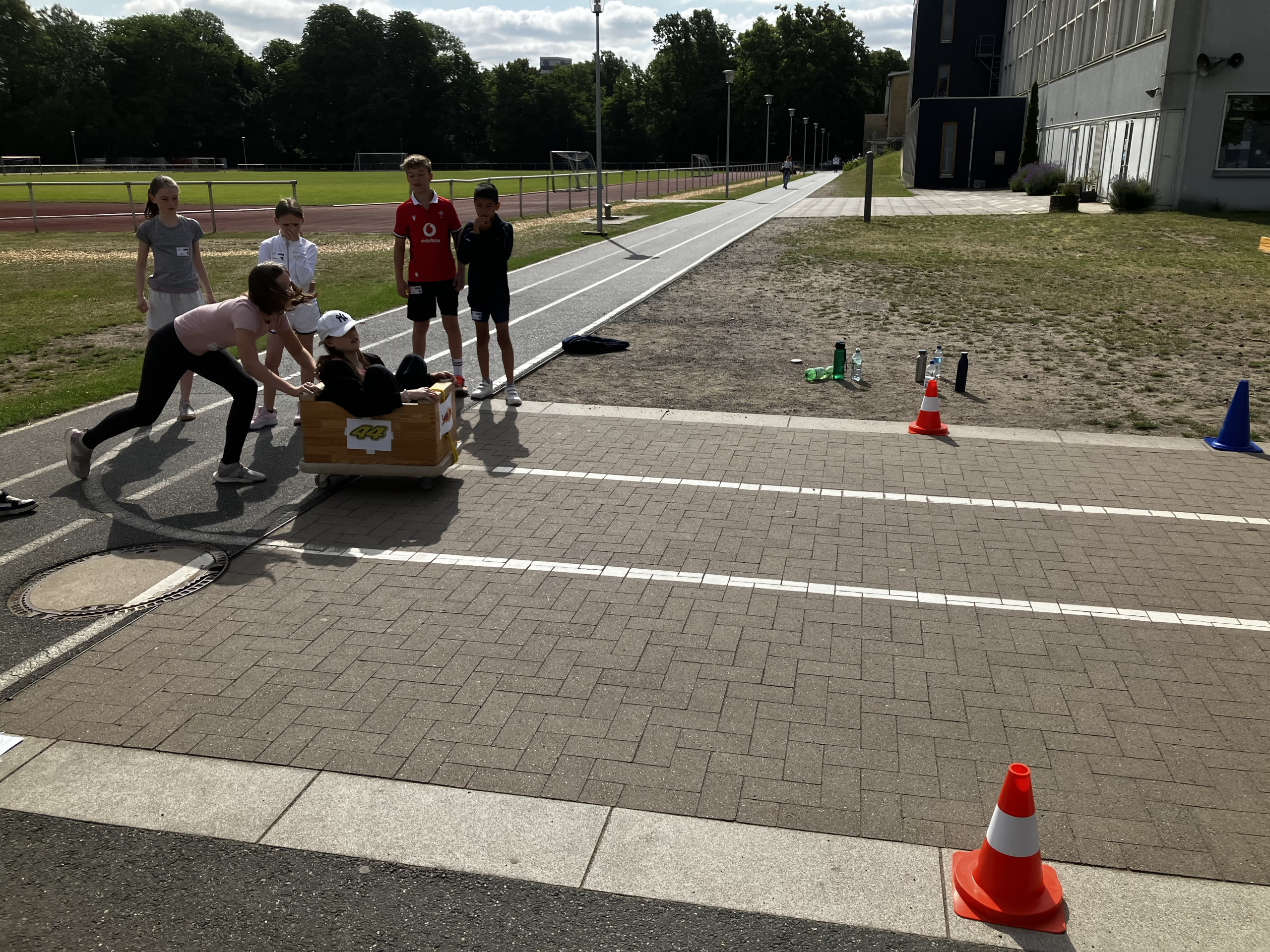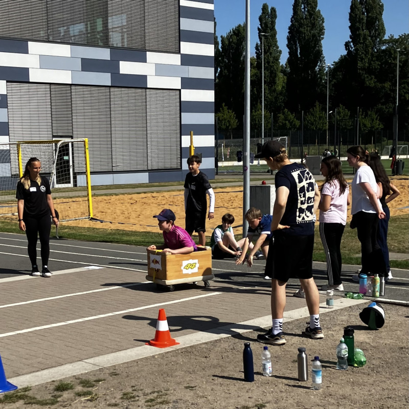 Sportstudierende hatten in einem Seminar 16 Herausforderungen für unsere Schülerinnen und Schüler geplant. Diese warteten auf dem Institutsgelände in den Bewegungswelten „Zirkus“, „Olympia“, „Klein gegen Groß“, „Champions League“ und „Formel 1“ auf die EBSler.