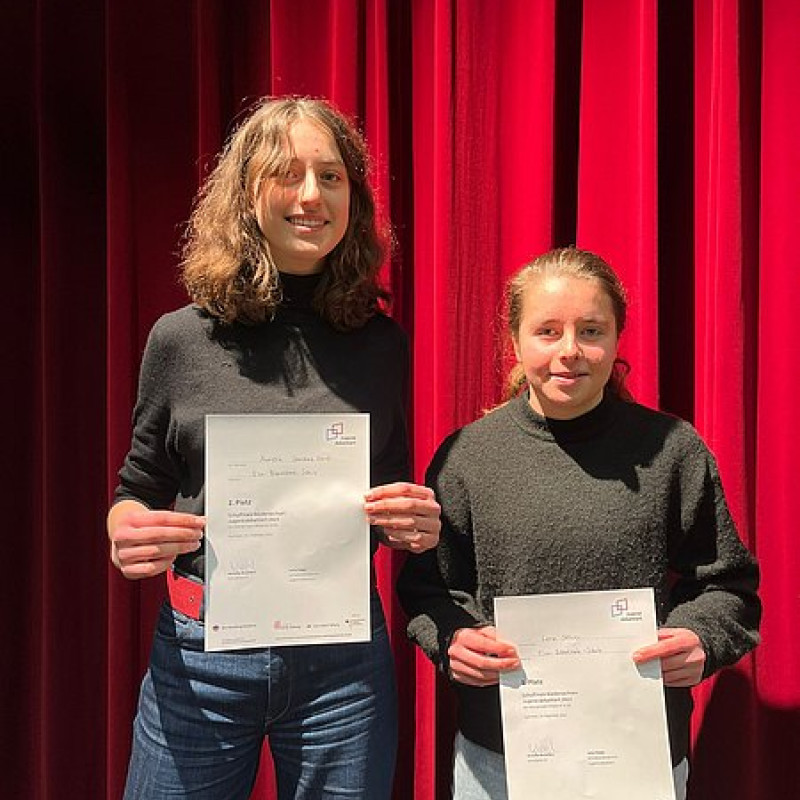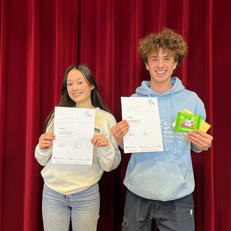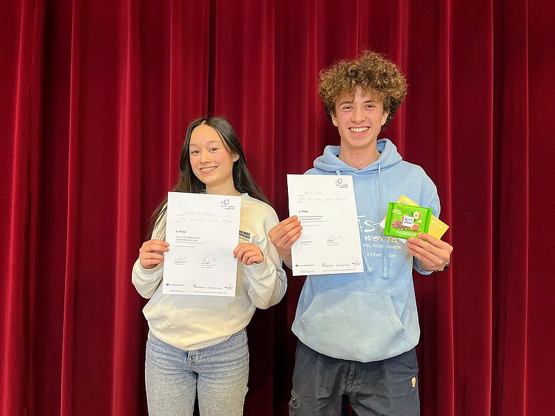 Lena und Aurelia bzw. Hannes und Chanel gingen als Sieger:innen im Schulwettbewerb hervor und erhielten neben einer Urkunde auch Gutscheine - gesponsert vom Förderverein der Elsa-Brändström-Schule. Unsere Sieger:innen haben die Elsa im Januar 2023 im Regionalwettbewerb an der Leibnizschule vertreten. Beide erste Plätze gingen dabei an die Elsa bzw. an Chanel Mai Pham (12. Jg.) und Lena Stöver (10. Jg.). Sie setzten sich dabei gegen die jeweiligen Schulsieger*innen der Bismarckschule, der Leibnizschule, der Helene-Lange-Schule, dem Georg-Büchner-Gymnasium und der Ricarda-Huch-Schule durch. Chanel und Lena werden unsere Schule bzw. den Regionalverbund Hannover am 14. März im Landeswettbewerb im Niedersächsischen Landtag vertreten.