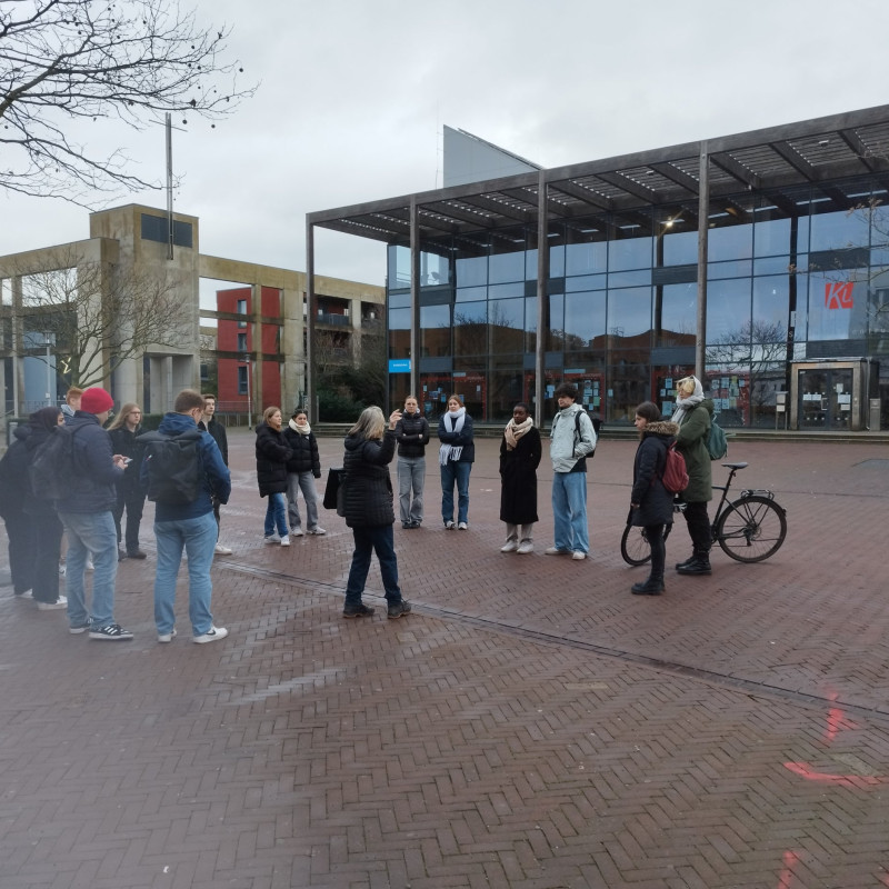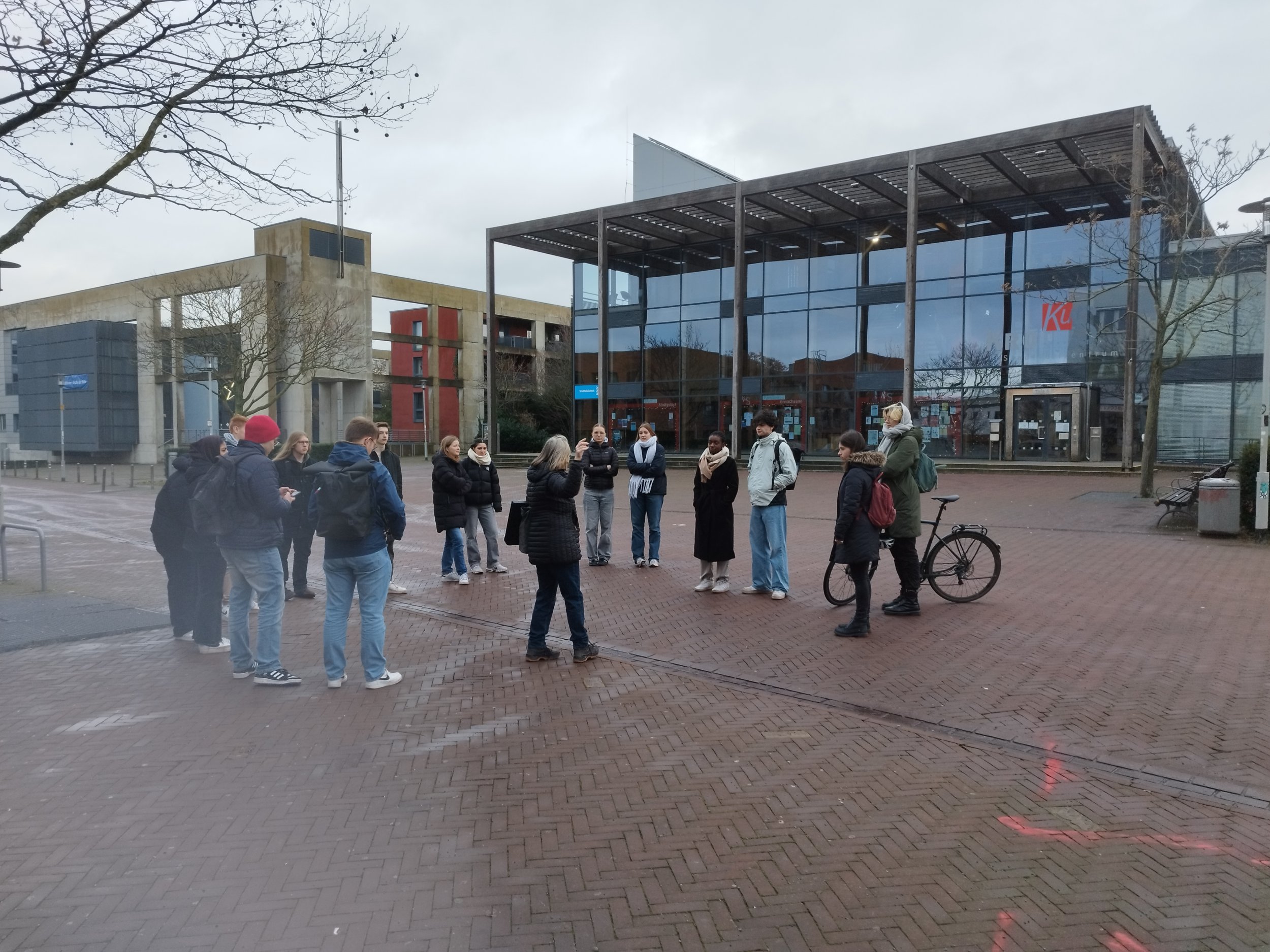 20.12.2023, 10:30 Uhr: Der Erdkunde Grundkurs aus Jg.12 von Frau Omayrat steht dick eingepackt und gerüstet für einen Spaziergang im Eingangsbereich des Stadtteilzentrum KroKus im Kronsbergviertel.