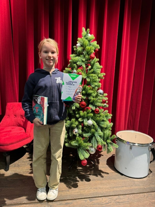 So kam das Publikum zunächst in den Genuss der vier selbst gewählten Bücher und daher auch ganz unterschiedlichen Texte und konnte danach staunen, wie gut die vier Leser:innen auch mit einem für sie völlig fremden Text zurechtkamen, den sie ohne Vorbereitung vorlesen mussten. Eine Jury, die aus zwei Lehrerinnen, einem Vertreter der SV und einem des Fördervereins bestand, entschied dann, dass Thea von den vieren am besten gelesen hat. Sie ist als Siegerin in der nächsten Runde beim Stadtentscheid dabei. Toll!
