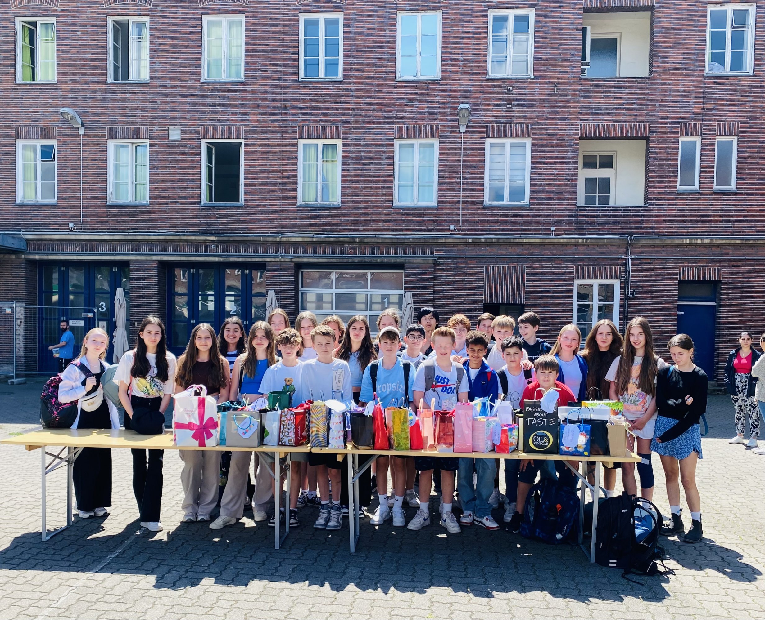 Am 27. Juni 2023 war es endlich so weit und wir zogen mit ca. 60 Tüten los, um diese persönlich zu übergeben. Das Treffen mit den geflüchteten Männern aus den unterschiedlichsten Ländern war herzerwärmend und ein echtes menschliches Highlight zum Ende des Schuljahres. Schnell rückten die dankbar entgegengenommenen Willkommenstüten in den Hintergrund und stattdessen die reale Begegnung in den Vordergrund. Obwohl der Unterricht nach der 6. Stunde längst beendet war, wurde auf dem Innenhof der alten Feuerwehr immer noch gemeinsam Fußball gespielt und Selfies geschossen.